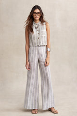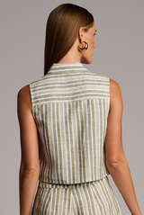 Designed in our signature 100% linen, the Katja Top pairs a sleeveless, boxy, yet not oversized silhouette with a crisp fold collar. Center front buttons and a soft hemline accent the cropped piece.