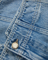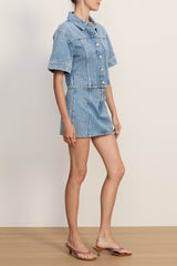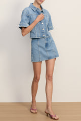 The essential denim mini. Crafted from premium non-stretch denim in a medium-blue wash, the Marquita skirt features a flattering mid-rise, A-line silhouette. A paneled, pocket-free construction keeps the look clean and streamlined. Pair it with a crisp white tee for ease, or style it with the matching Malcom Jacket for a double denim moment.