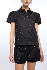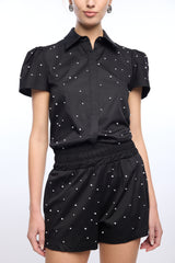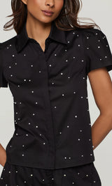 The Murphy Pearl Embellished Poplin Shirt reimagines a timeless classic with a touch of glamour. Crafted from crisp black stretch poplin, this short-sleeve button-down is adorned with delicate pearls throughout for a refined yet playful finish. Perfectly tailored and endlessly versatile, it pairs effortlessly with denim, skirts, or suiting separates.