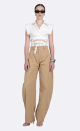 The Terry Crop is a sleeveless, wrap-style crop with an adjustable belt detail. Made from a soft yet structured cotton, it features a crisp collar and defined shoulders.