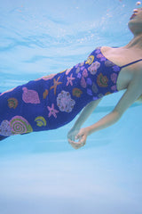 Elegant navy crystal-embroidered long dress featuring signature sea life beadwork and slender straps. A sophisticated ocean-inspired occasion dress suited for summer galas, sunset dinners, and resort eveningwear.