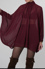 The Juliette Dress is sheer and airy with a high neckline and delicate back tie that frame its cape-like silhouette. Its fluid shape carries an effortless elegance — a piece that transforms with styling and moves with you.