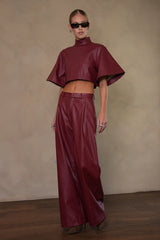 The Milo Pants are crafted in cherry red faux leather, lined for a flawless drape. A wide-leg cut, clasp closure, and belt loops balance modern tailoring with striking color. Effortless to style, they transform everyday dressing into a statement.