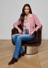 The Poetry cardigan blends softness and charm with a smooth contrast trim and tailored collar. Intricate stitch detailing frames the pockets and shoulders, adding a crafted edge to the bouclé knit. Finished with polished metal buttons and a cropped cut, it’s an effortless layer that elevates denim, tees, and tanks with subtle personality.