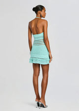The Saffy Crochet Dress captures effortless elegance with its delicate crochet construction and halter neckline. Designed with an easy pull-on fit, the open back adds an alluring touch, while the playful ruffle hem brings movement and dimension. Perfect for beach gatherings and sun-soaked getaways, this dress transitions seamlessly from daytime coastal strolls to evening celebrations. Shown here in Metallic Seychelles.