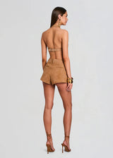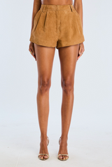 The Reyes Suede Short is crafted from soft suede with a pleated flare silhouette. Its smooth finish adds a sleek edge to any look. Wear it with the Windsor Suede Top for a matching set that’s ideal for music festivals and weekend plans. Shown here in Caramel.