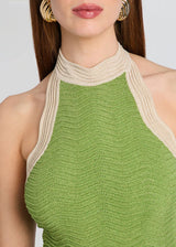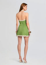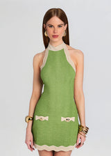 The Pascal Dress is a knit mini that pairs a classic silouette with contemporary accents, making it perfect for warm-weather occasions. It features a high neckline, colorblock trim, and a delicately scalloped hem. Gold button accents and faux pockets add refined touches, making it ideal for garden parties, resort dinners, or summer soirées. Shown here in Metallic Kiwi/Ivory.