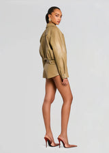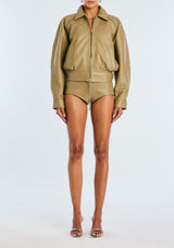 Mariel Leather Jacket is a versatile leather essential that elevates any outfit with understated sophistication. Featuring a sleek zip-up closure and structured collar, the Mariel achieves a polished yet edgy look, ideal for evenings out. Layer it over your favorite staples or pair it with the Marseille Shorts for a coordinated ensemble. Shown here in Musgo.