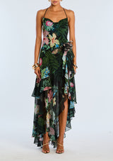 Channel your inner romance with our Samara Dress, featuring a whimsical ruffle hem, flowing silhouette, daring high slit, and captivating open back. Embrace the epitome of femininity and grace with this statement piece that promises to steal the spotlight at any occasion. Shown here in Noir Fleur Tropicale.
