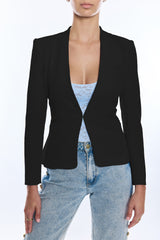 The Sebas Peplum Crepe Jacket in Black delivers polished structure with a feminine twist. Featuring clean lines, a sculpted waist, and a sleek open-front silhouette, this crisp jacket instantly elevates any look. Style it with denim for day or pair it with tailored trousers for a modern monochromatic moment.