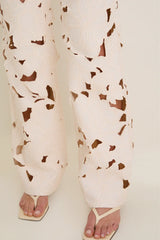 A straight leg jean that transitions into skillfully embroidered floral cut-outs down the length of the leg. Five pocket construction.