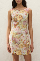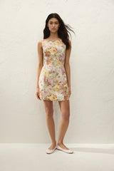 A nostalgic mini dress, designed from a signature 100% European Flax® linen in a vintage-inspired floral print, nodding to designs from the 1970s. Slightly relaxed in its silhouette, it is sleeveless with a boat neckline and fitted through the bodice. The back is open with oversized ties that hang effortlessly and the skirt flares into a slight A-line. Style with a simple sandal for long lunches under the sun.
