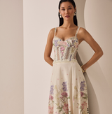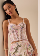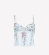 Let yourself be captivated by the POPPY TOP, a garment that blends romance and precision in its craftsmanship. Its structured silhouette with a sweetheart neckline enhances the bust with elegance, while the fine straps add a delicate touch. The bodice is adorned with embroidered lace applications that strategically frame the floral print, adding texture and sophistication. Perfect for creating summer looks with timeless charm and refined femininity.