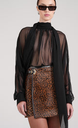 The Blaine Skirt is a leopard-spotted mini crafted from 100% cowhide leather. Designed in a wrap silhouette with an adjustable belt and gold hardware, it brings a touch of texture and print to any look. A timeless statement piece you’ll reach for season after season.