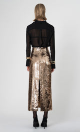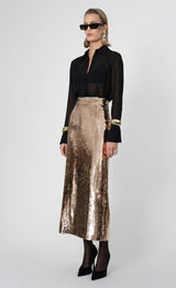 The Margaux Skirt is this season’s statement piece. Designed in our best-selling silhouette, it’s fully reversible—wear the zipper in the front for an edgier feel or at the back for a more refined finish. Crafted from shimmering gold sequins, it embodies elegance and allure, the NCHLNT way.
