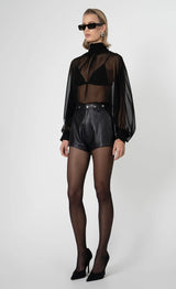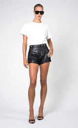 The Arden Shorts are chic mini PU leather shorts featuring silver stud button details along the waistband. A contemporary update to a classic silhouette—these are the statement shorts you'll keep coming back to all season long.