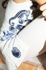 The New Orleans Dress is a white hand-beaded masterpiece featuring blue under-the-sea motifs. Pair with mules and a tan for dinner after a long day at the beach - or in the city, if you can't wait!