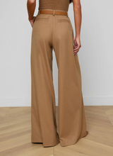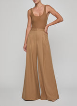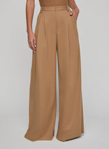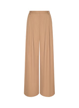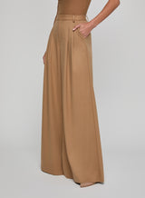 The Chelsy pant is a striking study in fluid tailoring, defined by its dramatic wide leg and sharp front pleats. Cut to sit high on the waist, it elongates the figure while moving with ease and elegance. Pair with a sleek blazer or let it flow against a fitted knit for a refined contrast. Now back in a neutral tan.