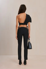 A tailored, straight leg pant in stretch suiting with caged hip cutouts and bow details.