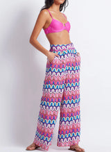 These wide leg pants are made from a crochet fabric and have a mid-rise fit. Feature two functional side pockets and and pleats on the front. Lined. Runs true to size. Model wears size small.