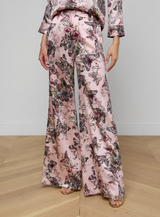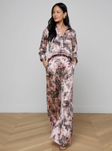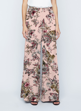 Pilar is the perfectly proportioned pant, renewed each season in fresh fabrications and colorways. Now updated in light pink silk with a whimsical butterfly jungle print.