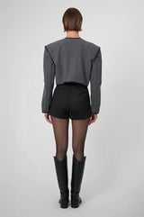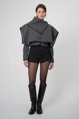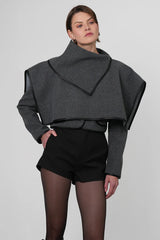 The Lea Cape Jacket reimagines outerwear with an architectural edge. Cut in a wool blend, this cropped silhouette features an overlapping cape design trimmed in sleek black binding for definition. A sculptural collar frames the neckline, while the layered construction brings volume and movement. Underneath, a tailored cropped jacket fastens with front buttons, adding function to form.