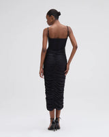 This midi dress features a two tone hand woven rope top with double keyhole cut out and ruching throughout the skirt. With adjustable straps and concealed back zipper closure.