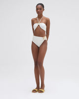 This bodysuit features a hand woven designed bodice  with intricate cut out detailing, and a halter neckline with tie closure. The bottom of the bodysuit is a solid lycra fabric.