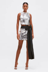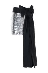 This silver sequin mini skirt brings a bold, glamorous energy with a playful twist. It features a contrasting black satin waistband and an oversized black bow that cascades dramatically to the floor. A striking piece that pairs shimmer with statement design, perfect for evening looks that turn heads.