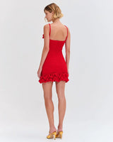 This mini dress is made of stretch jacquard with a fitted bodice and a ruffled design along the square neckline and hemline. Concealed back zipper closure.
