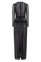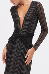 Crafted in a gleaming metallic mesh, the Golden Weave Gown is a sleek, sculptural silhouette that flatters with its figure-hugging fit and bold cut-outs. The bodice features delicate crossover straps and a central twist detail that enhances the bust, while the open back closes with a statement buckle. A striking choice for evenings when only drama will do.