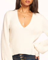 A wear-on-repeat fall staple with luxe, feminine details, the Aurinda is a cute and cozy sweater crafted from a recycled wool blend. It features contrast stitching, a v-neck, slightly shorter hemline, and subtle balloon sleeves. The Aurinda's styling opportunities are endless; It’s the perfect complement to a flirty mini skirt and boots, or flare jeans for a cozy, classic look.