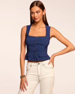Structure meets simplicity in The Aster. Featuring a square neckline, decorative faux pockets, and snap details, this sleeveless top brings an element of polished sophistication to any look.