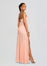 Step into elegance with our Adele Dress. Crafted to captivate, our gown combines the timeless charm of a strapless silhouette with the allure of sheer detailing, creating a mesmerizing look that exudes sophistication and romance. Shown here in Peche.