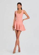Step into sophistication and radiate elegance with every step in our Brooke Dress, crafted to exude elegance and charm. Adorned with chic buttons down the center, this dress adds a touch of refinement to your ensemble, while the flared hem lends a playful and girly vibe. Perfect for any occasion, from cocktail parties to dinner dates, this dress effortlessly combines class and femininity for a look that is both timeless and chic. Shown here in Metallic Peche.