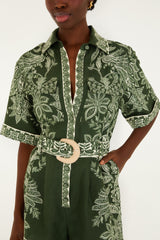 Embrace effortless charm with the Dark Green Miranda Belted Romper from FARM Rio. Crafted in breathable Euroflax™ premium linen, its rich green hue is complemented by a structured collar neckline and a flattering belted waist that sculpts the silhouette. The relaxed yet elegant cut flows with ease, inviting movement and comfort while reflecting the brand’s playful spirit and love for natural textures. Perfect for warm days that call for both style and softness.