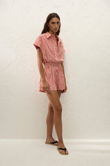 A vacation-inspired playsuit, designed from a signature 100% BCI Certified organic cotton in a yarn-dyed dusty tomato and white stripe. Relaxed in its fit and slightly oversized, the shirt features a classic collar with a V-neckline and front buttons as well as short cap-style sleeves. It is elasticated at the waist with a simple drawstring, before falling into a boyfriend-style short with side seam pockets. With lightweight throw-on throw-off appeal, pack for your next summer vacation. This style is intended to be slightly oversized. We recommend opting for your true size. The elasticated waist offers additional stretch.