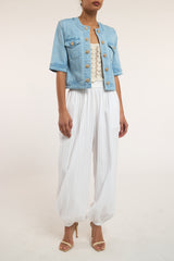 A collarless design, decorative buttons, and a cropped silhouette elevate the classic denim jacket into a chic summer essential. The perfect layering piece for warm-weather styling.