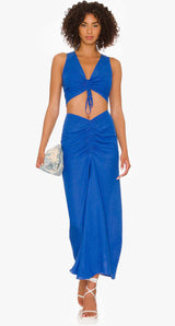 This season’s must-have top is made in a super-soft blend. The sleeveless silhouette features a V-neck with an adjustable front cinching detail at center and an exposed back with a loop button closure.
