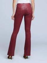 A deep red hue puts a striking spin on this classic boot-cut high-rise jean. Features a contoured waistband that fits securely just above the natural waist, then hugs from hip to knee before releasing into a slim bootcut hem. Coated premium stretch denim has a luxurious sheen and high recovery that holds its shape. Classic five-pocket construction and front zip fly closure.