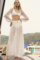 This versatile top can be styled as a cropped top or swim bikini top. Bust is made from waterproof, stretch Lycra fabric and features a sweetheart neckline with gold-tone barbell hardware at center. Long sleeves are made from modal lace fabric and feature slightly pointed shoulder details. Back metal clasp closure. Unlined. Runs true to size.