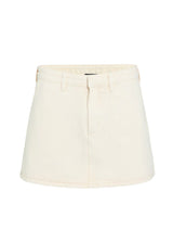 A-line, mid rise denim mini skirt. Shown here in Eggshell.