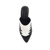 Ama makes a statement with layered black and white leather in a striking overlapping pattern. The open pointed toe and full-coverage upper create a sleek, modern silhouette, while the sculptural fluted heel adds architectural interest. The contrasting tones and textured layers make Ama a standout choice for elevating everyday outfits or adding a contemporary edge to event looks.
