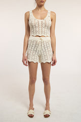Chic and summery, these pointelle chevron knit shorts feature crystal embellishments for a hint of shine, a scalloped edge, and a tie waist. The perfect warm-weather piece to pair with the coordinating tank or your favorite top.