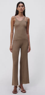 The Saga Metallic Rib Tank in Marigold. The essential tank silhouette, modernized in our sculpted rib knit with subtle shimmer and an unexpected abstract cutout.