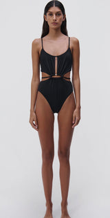 The Genesis One Piece in Black. Striking one piece swimsuit adorned with darted bust cutout and cheeky waist barring cutouts with slinky wrap around accents that meet a square, open back.