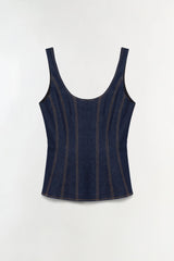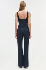 A sleeveless structured denim bustier top with a scoop neckline, contrast seaming, and subtle flare at the waist.