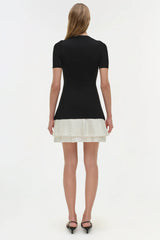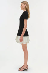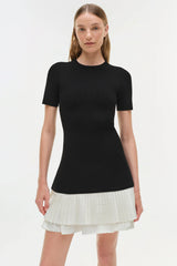 A mixed-media mini dress with a short sleeve, crew neckline knit upper and double layer skirt with a micro-pleated taffeta over layer.