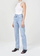 An update to our best-selling criss cross fit. This true straight silhouette is cut with a high rise, offset back waistband and criss cross button-front detail.