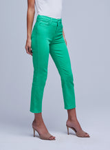 A high-rise, cropped straight-leg jean in medium-blue. Premium stretch denim infused with a touch of luxurious cashmere that gives the fabric a soft, pliable hand that forms beautifully to the figure. Flattering design gently hugs though waist, hip and thigh before extending straight to cropped hem. Five-pocket construction and front zip fly closure.